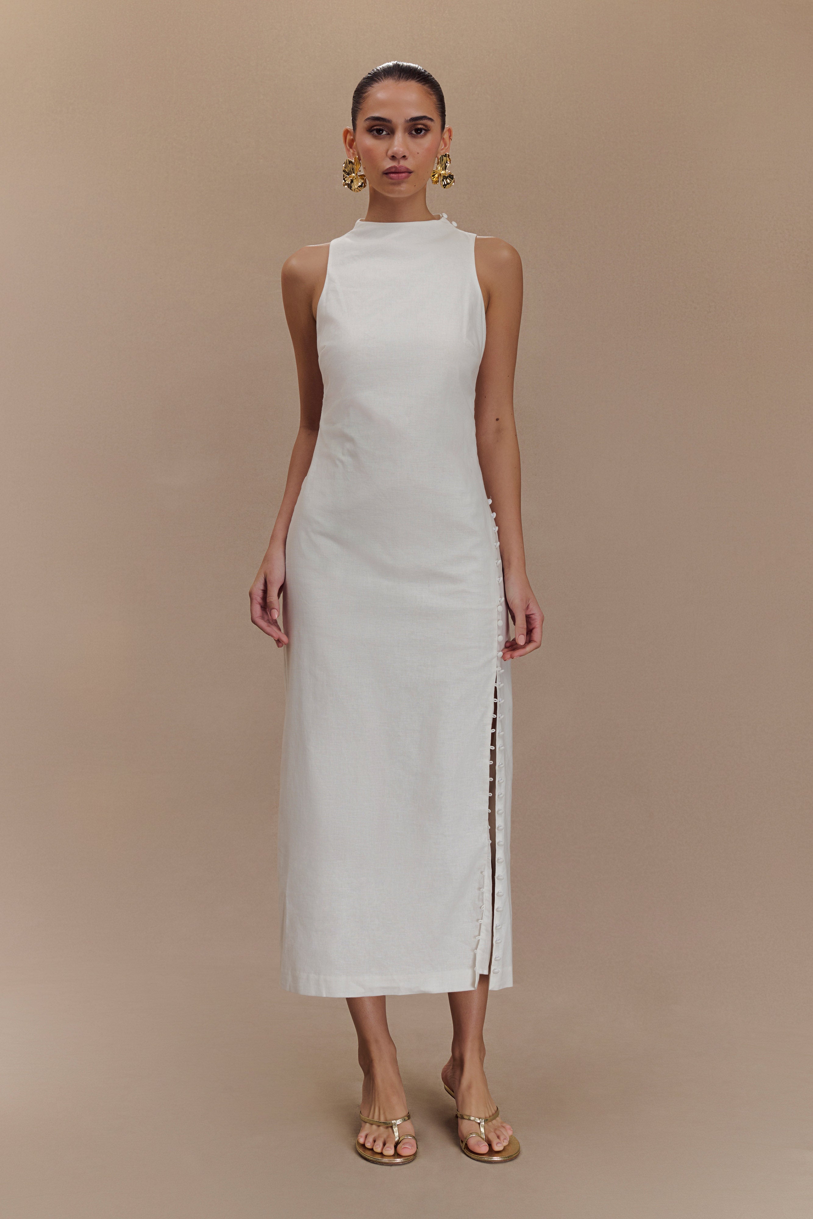 Elevate your style with the BRONTE Linen Button Midi Dress, a stunning blend of elegance and modern sophistication. This dress features a high neckline and a fitted silhouette that beautifully accentuates your figure, while the sleeveless design ensures a chic, contemporary look. The open button detail at the back cutout adds a playful twist, and the flattering midi length provides a refined touch. Fully lined for comfort, the dress also includes a button detail side leg split that introduces a hint of allure and ease of movement.